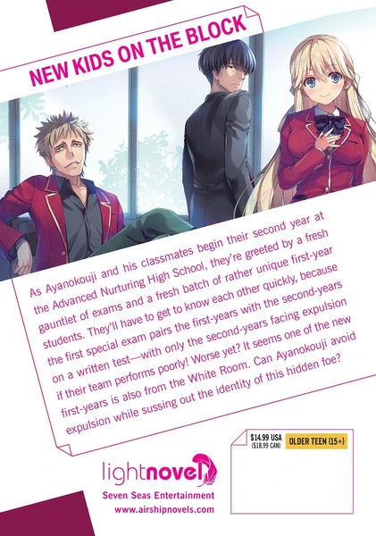 As Ayanokouji and his classmates begin their second year at the Advanced Nurturing High School, they’re greeted by a fresh gauntlet of exams and a fresh batch of rather unique first-year students. They’ll have to get to know each other quickly, because the first special exam pairs the first-years with the second-years on a written test—with only the second-years facing expulsion if their team performs poorly! Worse yet? It seems one of the new first-years is also from the White Room. Can Ayanokouji avoid expulsion while sussing out the identity of this hidden foe?