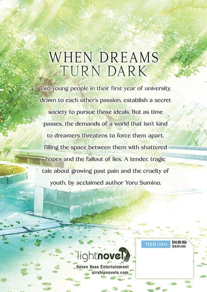 Two young people in their first year of university, drawn to each other’s passion, establish a secret society to pursue those ideals. But as time passes, the demands of a world that isn’t kind to dreamers threatens to force them apart, filling the space between them with shattered hopes and the fallout of lies. A tender, tragic tale about growing past pain and the cruelty of youth, by acclaimed author Yoru Sumino.