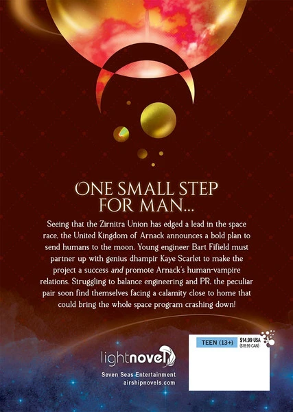 Seeing that the Zirnitra Union has edged a lead in the space race, the United Kingdom of Arnack announces a bold plan to send humans to the moon. Young engineer Bart Fifield must partner up with genius dhampir Kaye Scarlet to make the project a success and promote Arnack’s human-vampire relations. Struggling to balance engineering and PR, the peculiar pair soon find themselves facing a calamity close to home that could bring the whole space program crashing down!