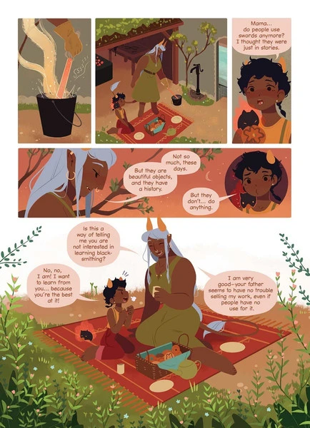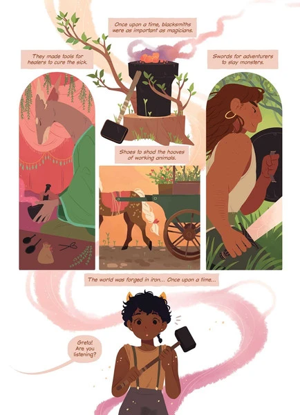 After discovering a lost tea dragon in the marketplace, Greta learns about the dying art form of tea dragon caretaking from the kind tea shop owners, Hesekiel and Erik. As she befriends them and their shy ward, Minette, Greta sees how the craft enriches their lives—and eventually her own.