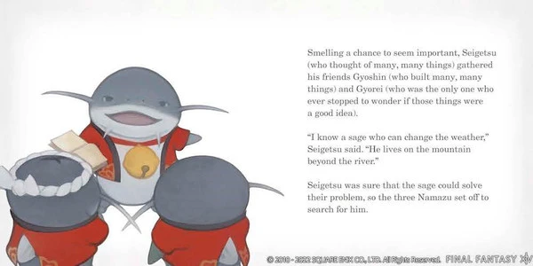 Final Fantasy XIV Picture Book: The Namazu and the Greatest Gift is presented in this hardcover edition created by Square Enix and was written by lead FFXIV story designer Banri Oda with illustrations by concept artist Hiroyuki Nagamine.